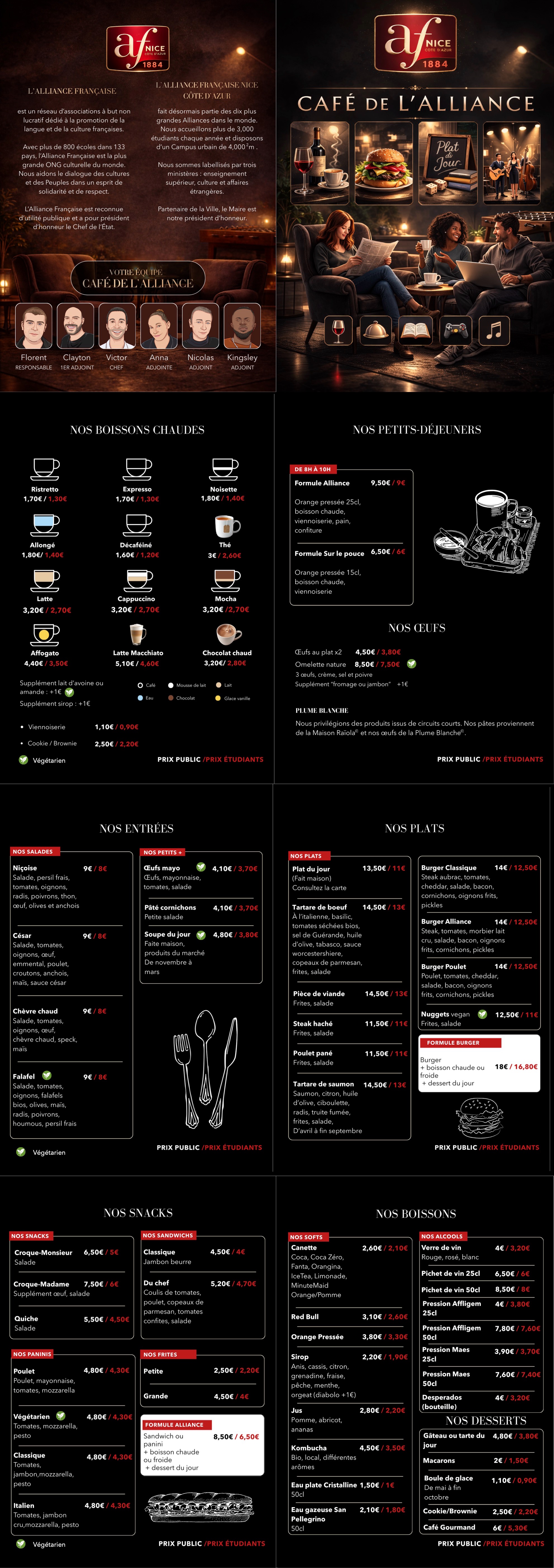 Le Café de l’Alliance est ouvert à tous du lundi au vendredi de 7h30 à 18h et de 8h à 17h le samedi et dimanche.